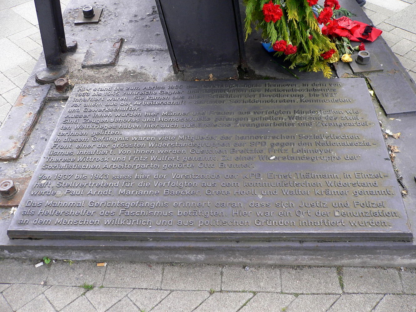 Hannover: Inschrift des Mahnmals am Ort des ehemaligen Gerichtsgefängnis vor dem Kulturzentrum „Pavillon“. Foto von Rainer Hoffschildt, 2005. Wikimedia Commons