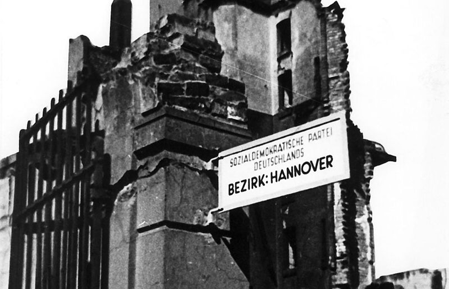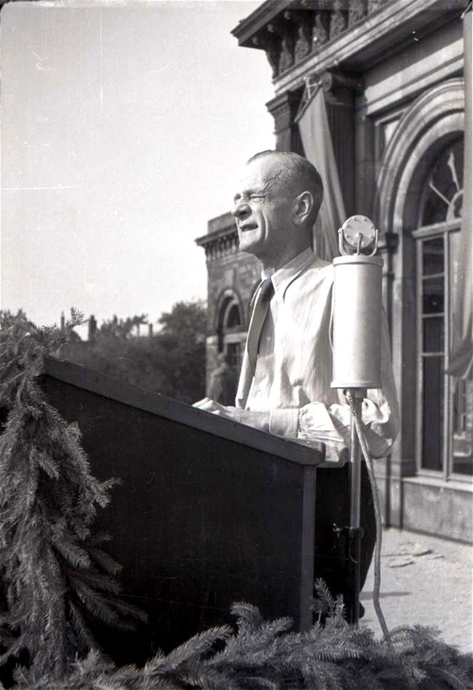 Hannover: Ankunft von Kurt Schumacher, gestützt von Egon Franke (ganz rechts Annemarie Renger), auf einer Kundgebung der SPD auf dem Waterlooplatz, 17. August 1946. Archiv der Region Hannover, Nachlass Koberg, Nr. 1051 (90/1305/3)