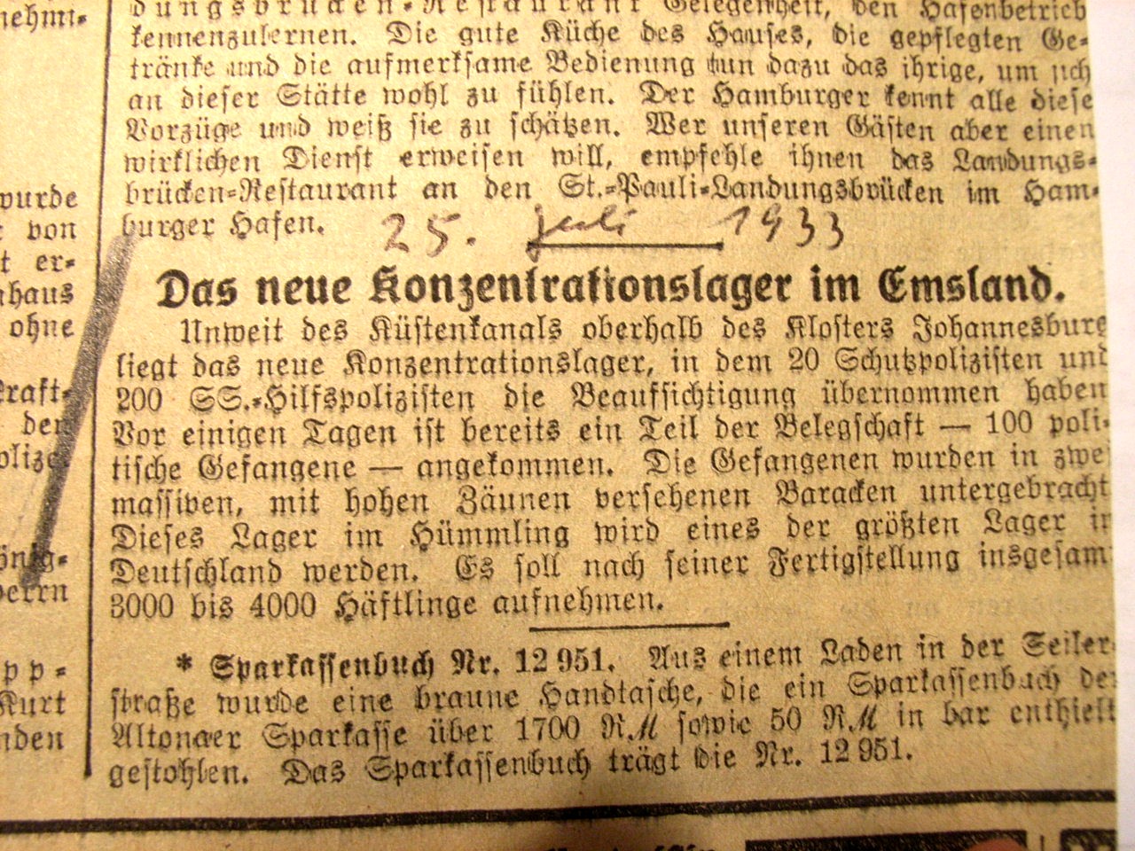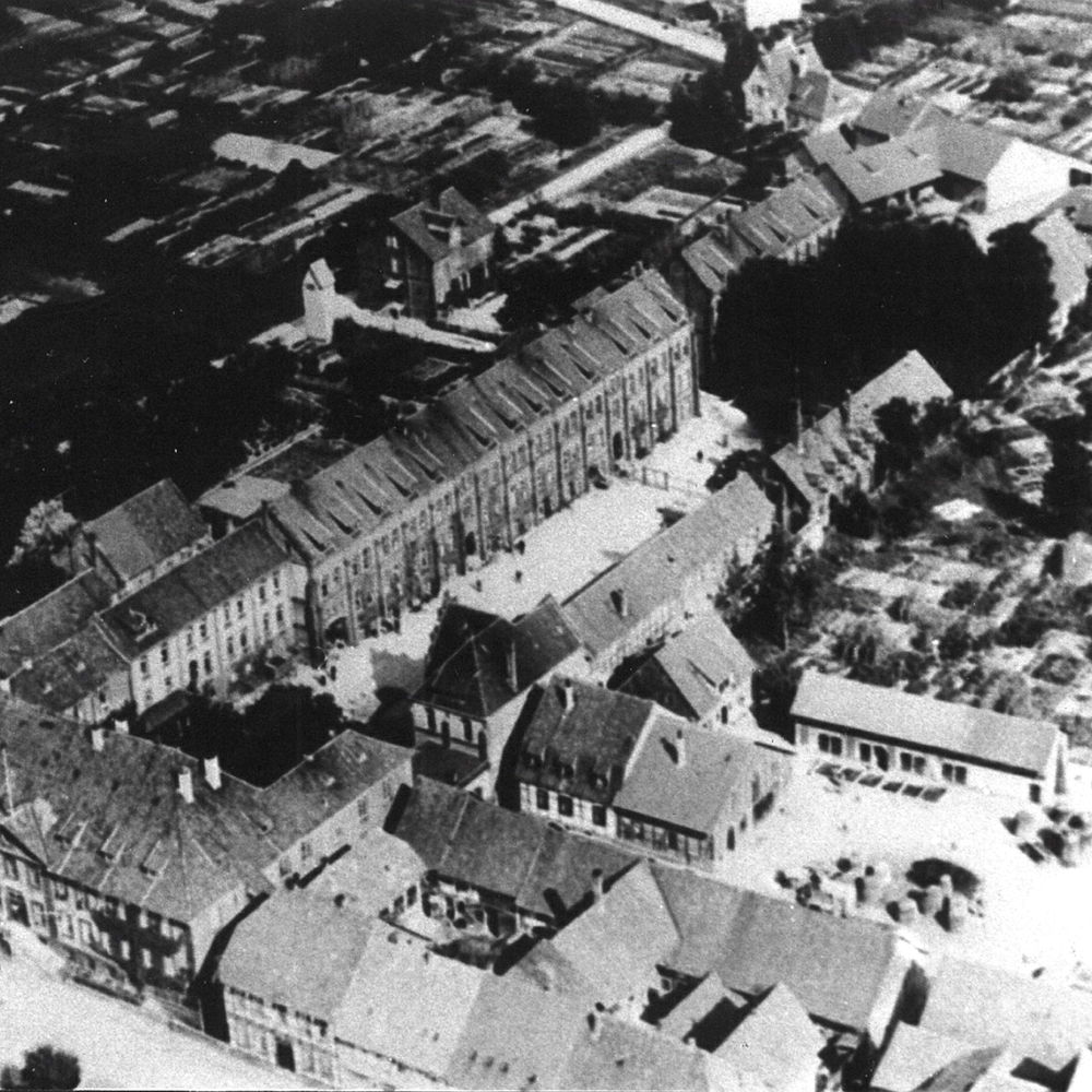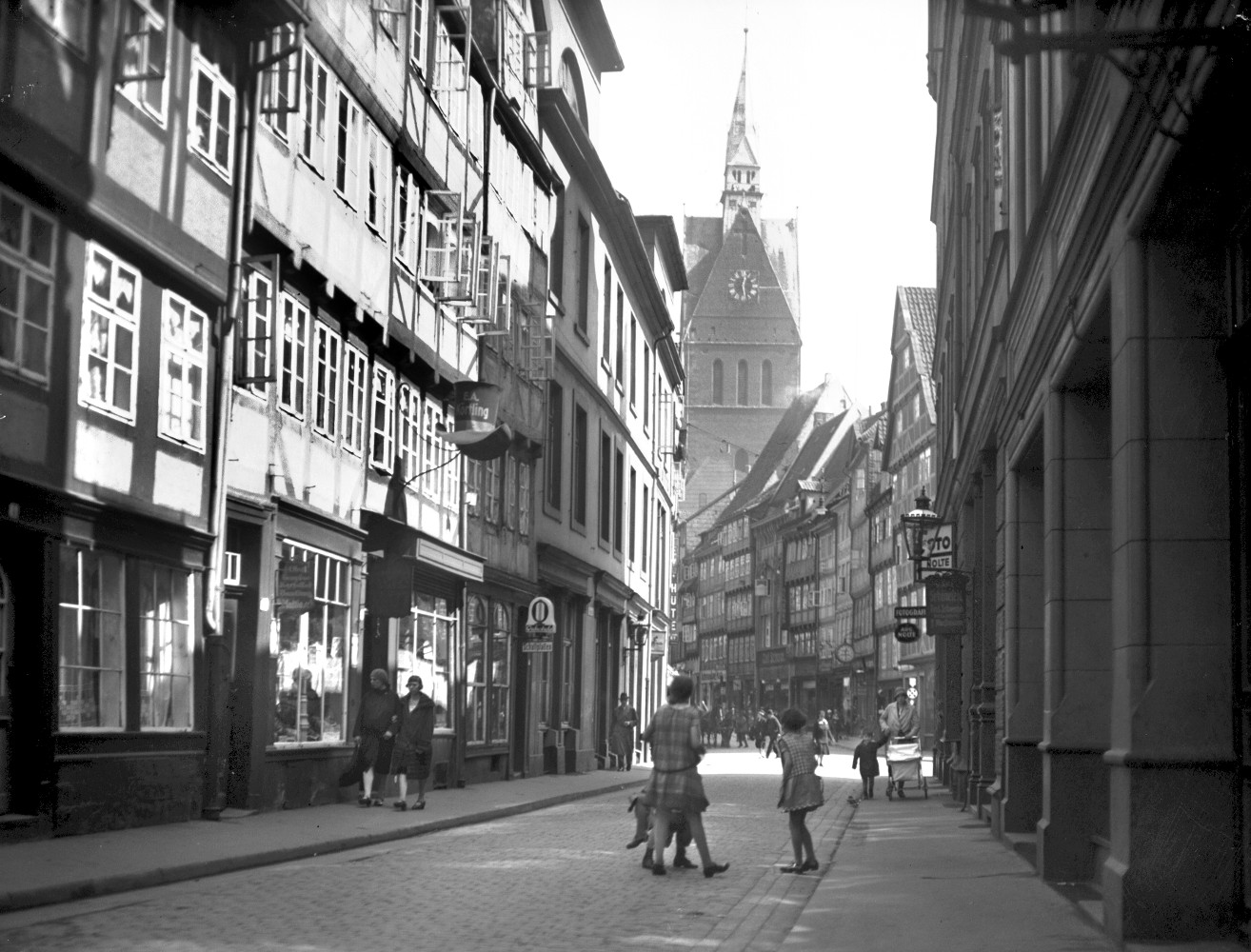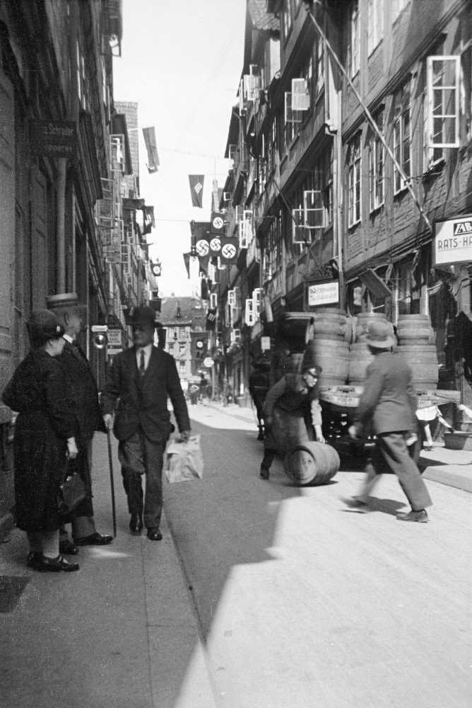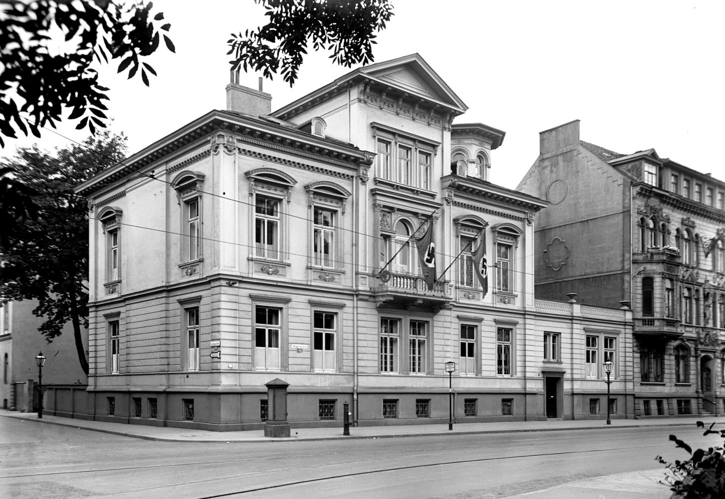 Hannover: Eckgebäude Straße der SA 26 (vor 1933: Lange Laube) und Dincklagestraße (vor 1933: Kurze Straße). Links am Bildrand das Gebäude der Gauleitung in der Dincklagestraße 3. Lt. Adressbuch 1939 gehörte das Eckhaus der NSDAP-Gauleitung, Verwalter war der Gauschatzmeister, Bewohner der NS-Rechtswahrerbund. 1941 ist in Hausnummer 25 rechts am Bildrand das nationalsozialistische Langemarck-Studium untergekommen, die Hausnummern 24 und 23 haben als Besitzer ebenfalls die Gauleitung und als Bewohner u.a. die NS-Frauenschaft und das Deutsche Frauenwerk. Foto von 1937. HAZ-Hauschild-Archiv im Historischen Museum Hannover