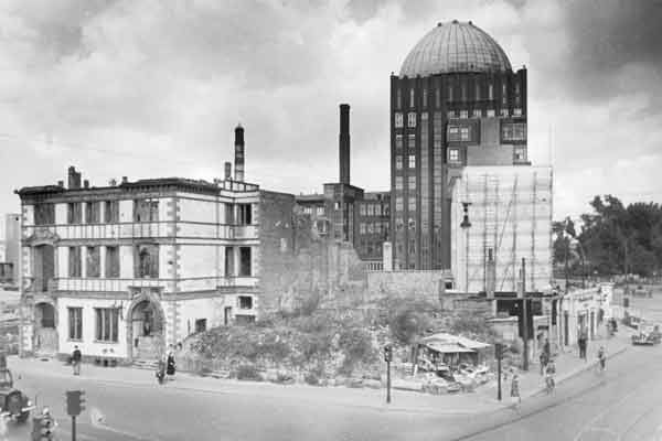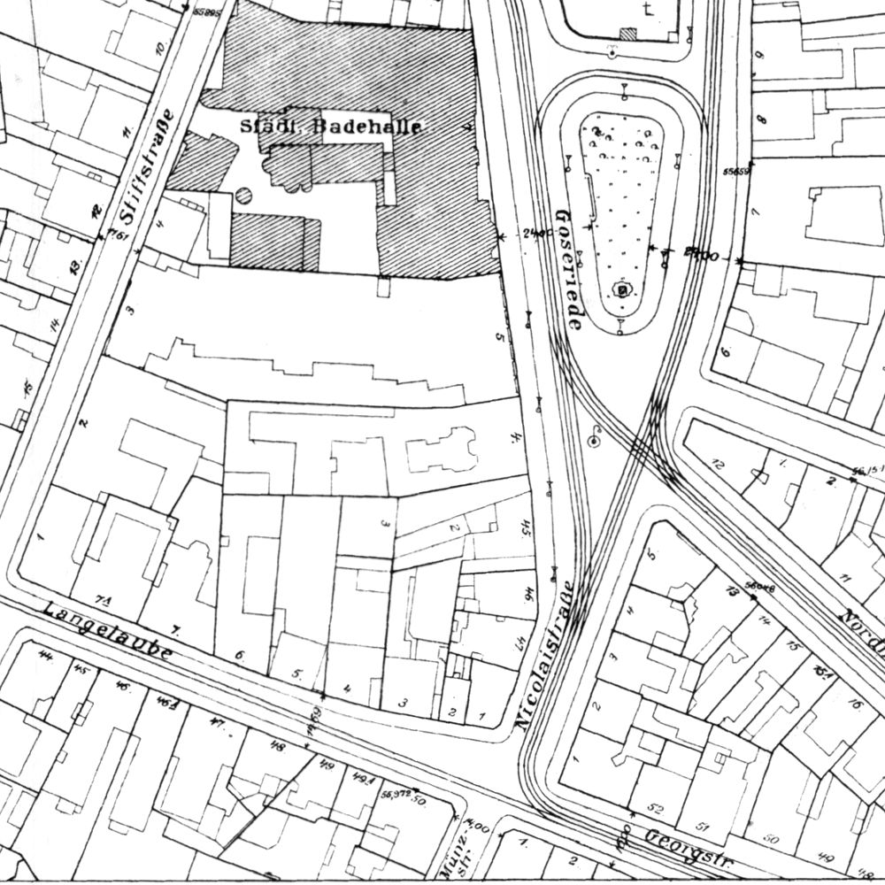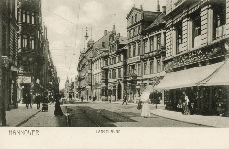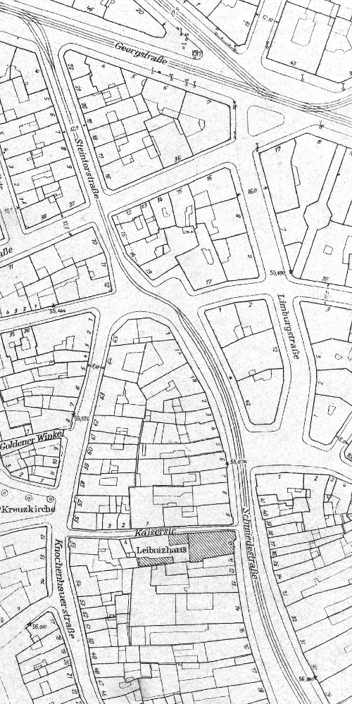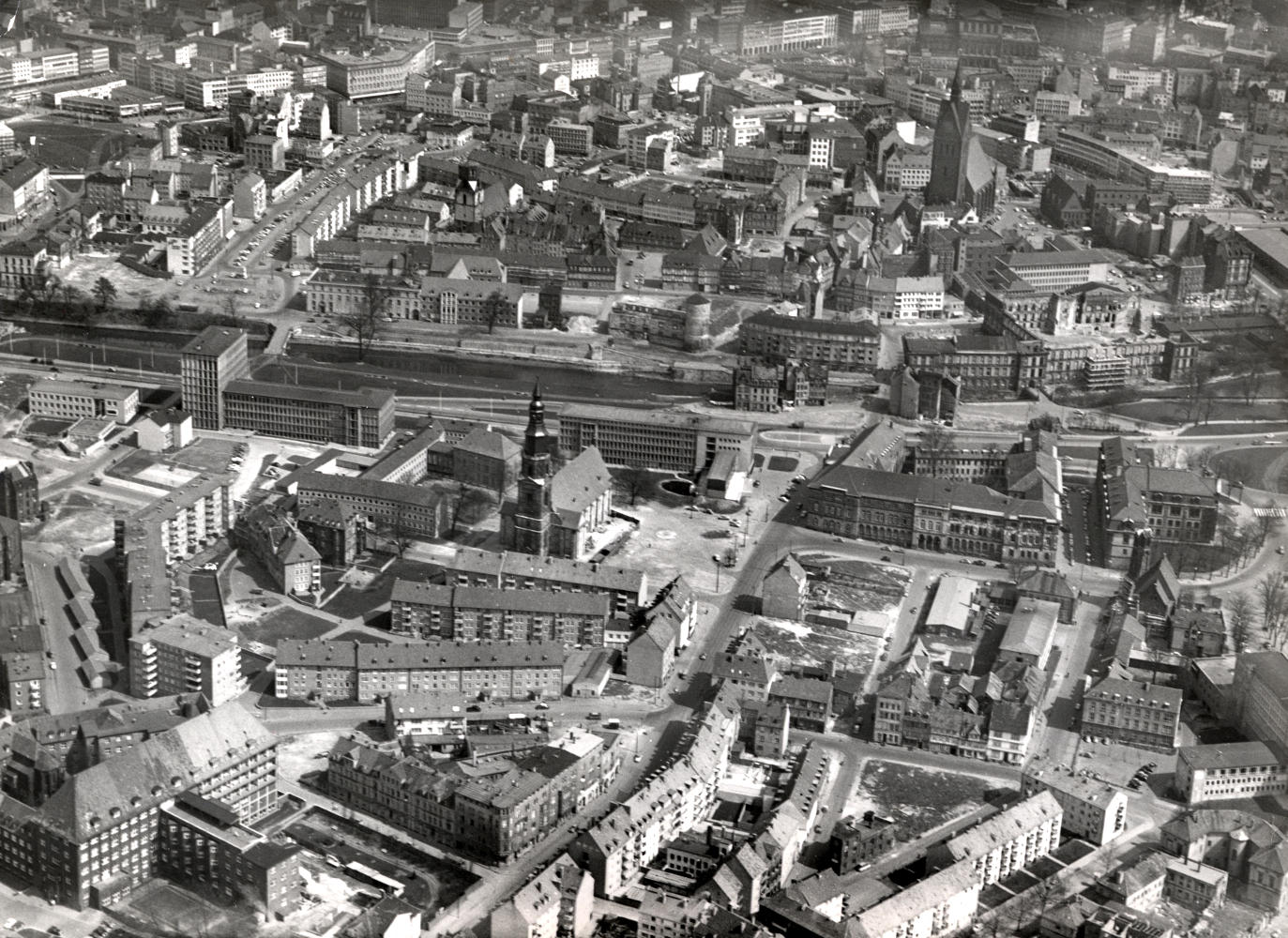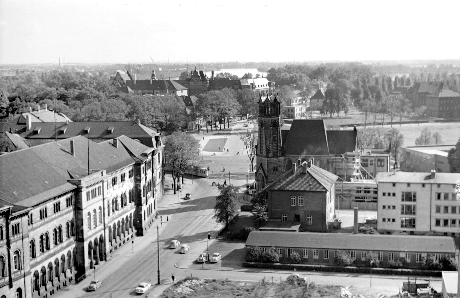 Hannover: Luftbild der Calenberger Neustadt von Heinz Koberg, Anfang 1958: In der Mitte diagonal die Calenberger Straße zwischen Friederikenstift und Leineschloß. Vor den ehem. Regierungsgebäuden die nahezu vollständig zerstörte Wagenerstraße. Bildarchiv Historisches Museum Hannover