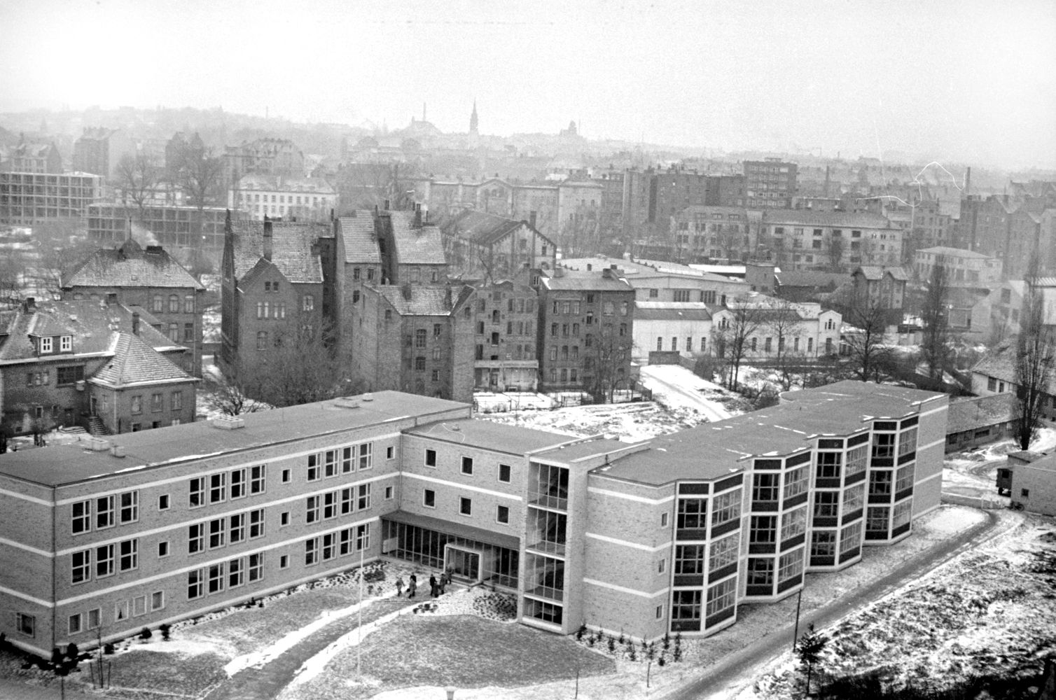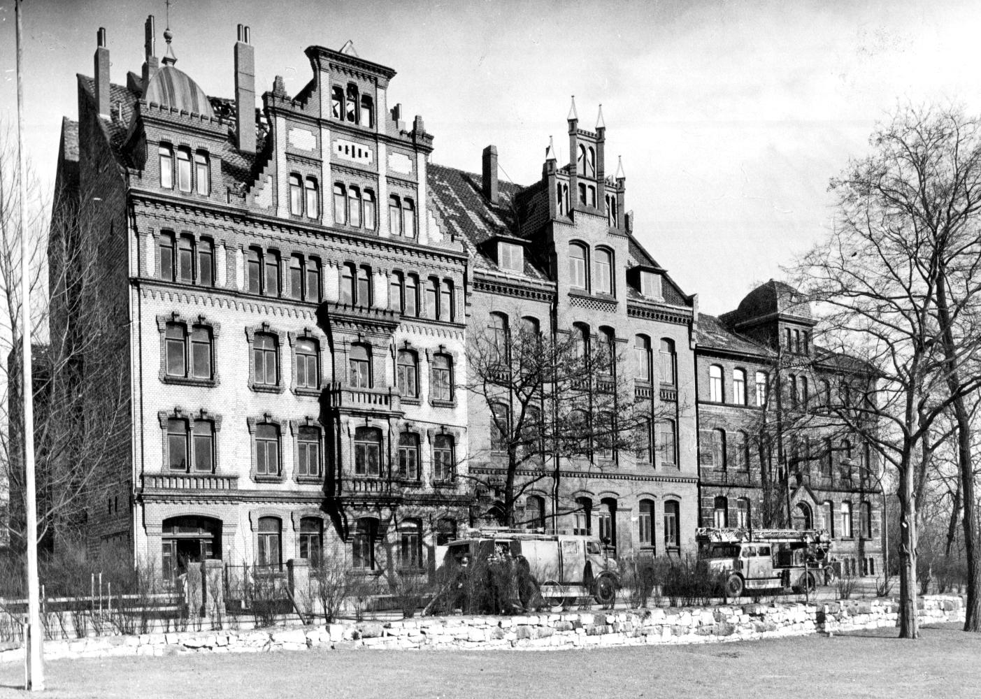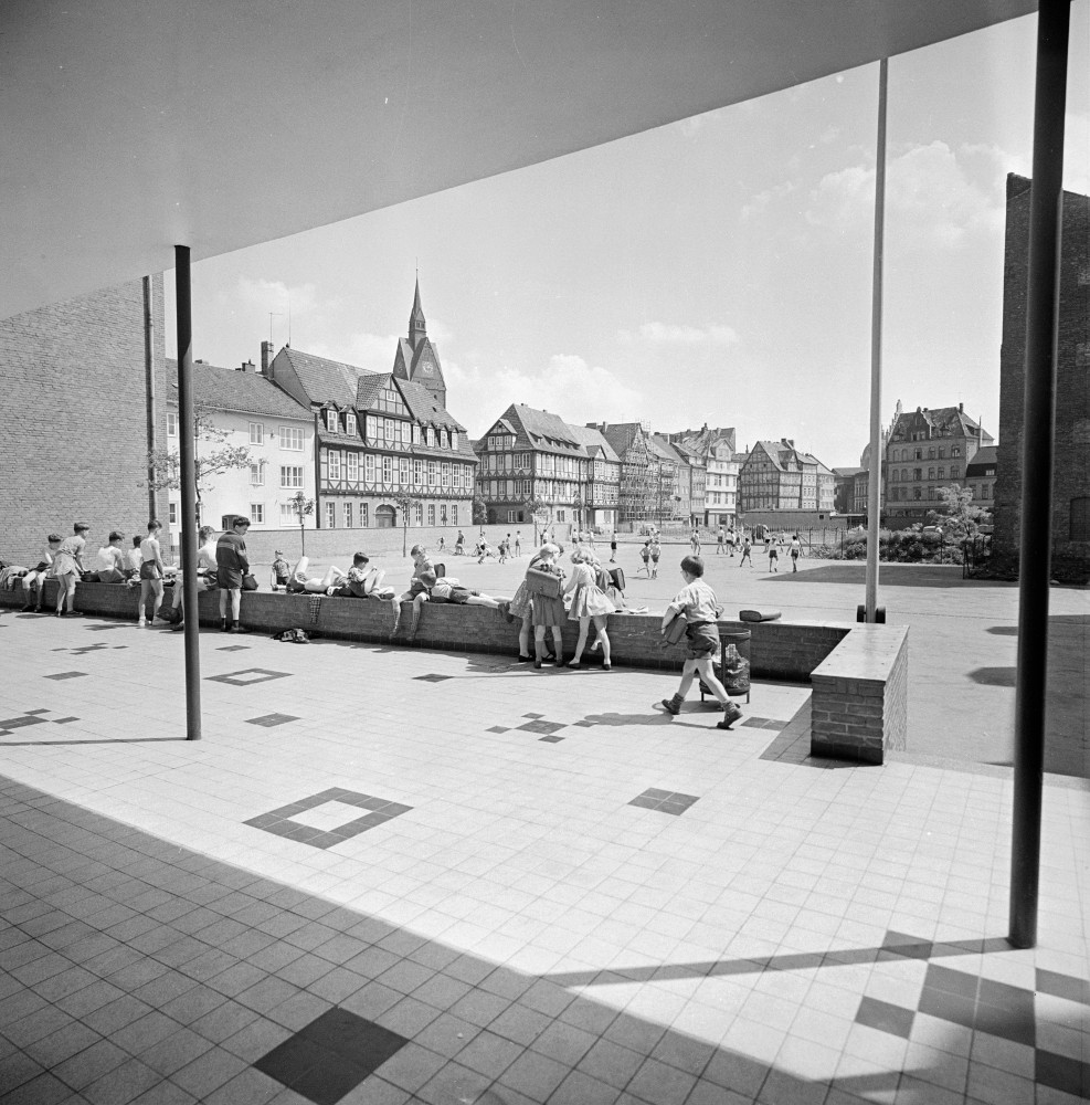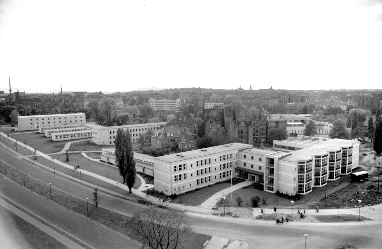 Hannover: Blick von der Waterloosäule auf die Berufsschule Lavesstraße/Ohestraße, ohne Jahr (1950er Jahre). Fotograf Wilhelm Hauschild. HAZ-Hauschild-Archiv im Historischen Museum Hannover