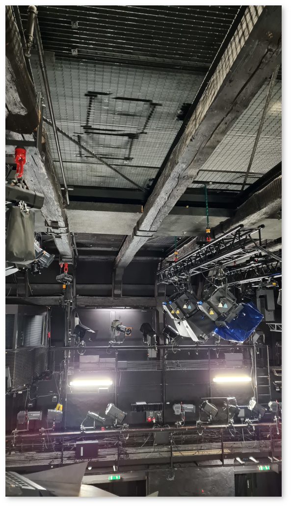 Alte Eichenbalken und moderne Bühnentechnik: Decke des Ballhof Eins, Spielstätte des Staatsschauspiel Hannover, 2022. Foto Michael Pechel