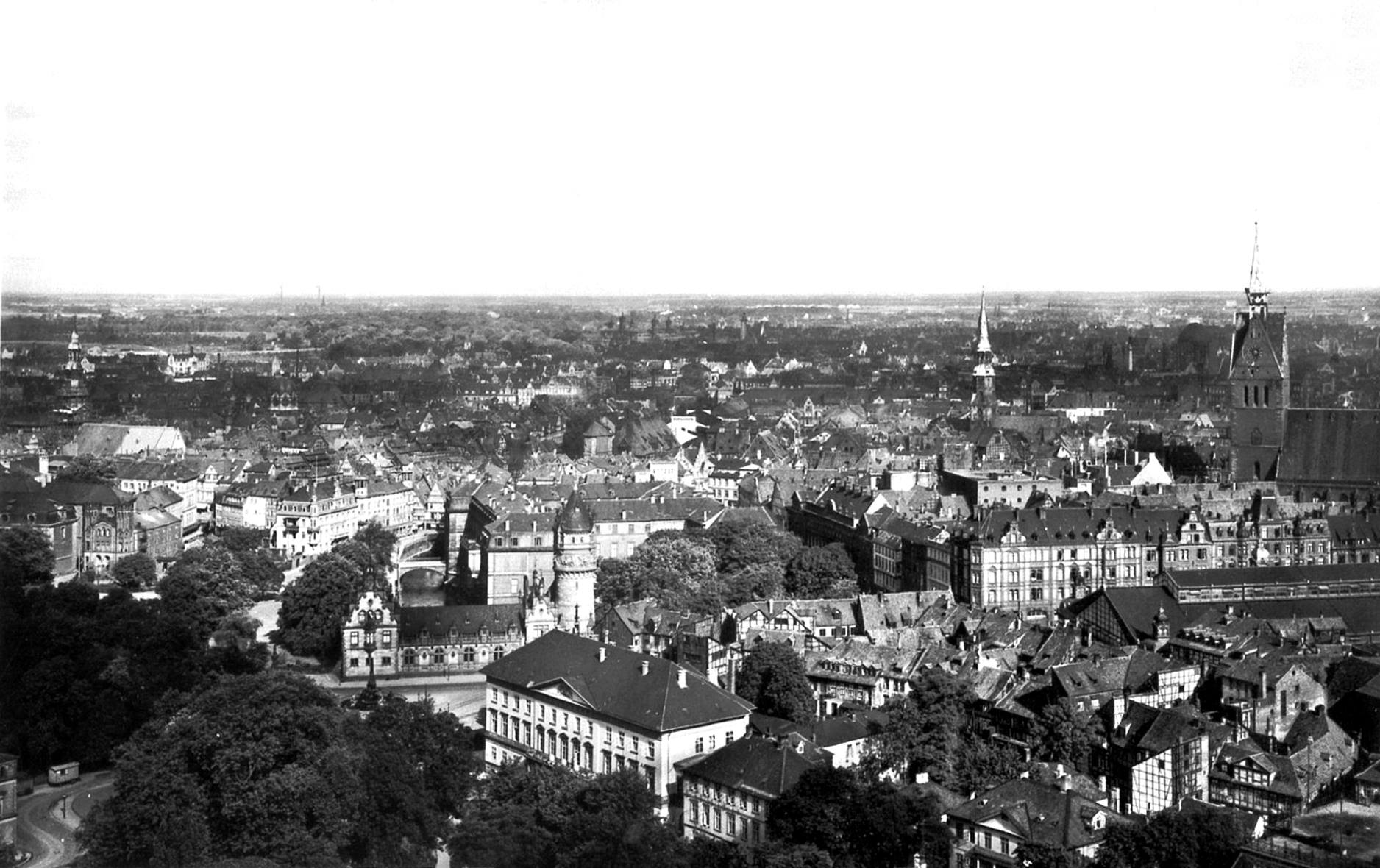 Blick von der Kuppel des Neuen Rathauses in Richtung Leineschloss. Zwischen Neustädter Kirche und Schloss ist die Kuppel der Neuen Synagoge in der Calenberger Neustadt zu erkennen, das Foto entstand also vor dem November 1938. Quelle. HRC