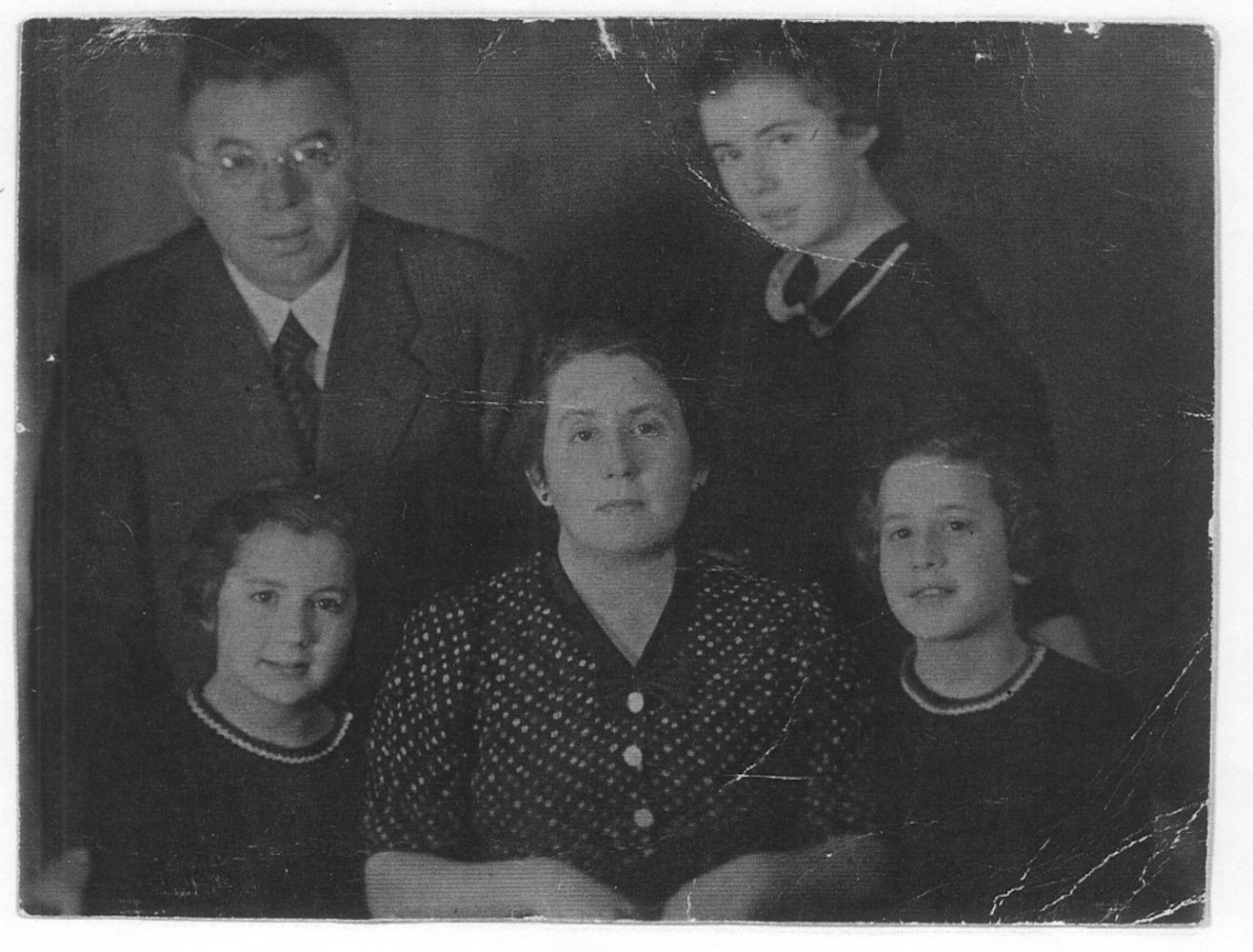 Letzte gemeinsame Aufnahme der Familie Herskovits vom 3.Januar 1939: Links Gemeindesekretär Samuel Herskovits, in der Mitte Ehefrau Helene Herskovits, geb. Kiss zwischen den Zwillingen Ruth (links) und Eva. Tochter Margarete (rechts oben) emigrierte 1939 nach Großbritannien. Tochter Klara Herskovits (nicht auf dem Bild) wurde als „behindert“ getötet.