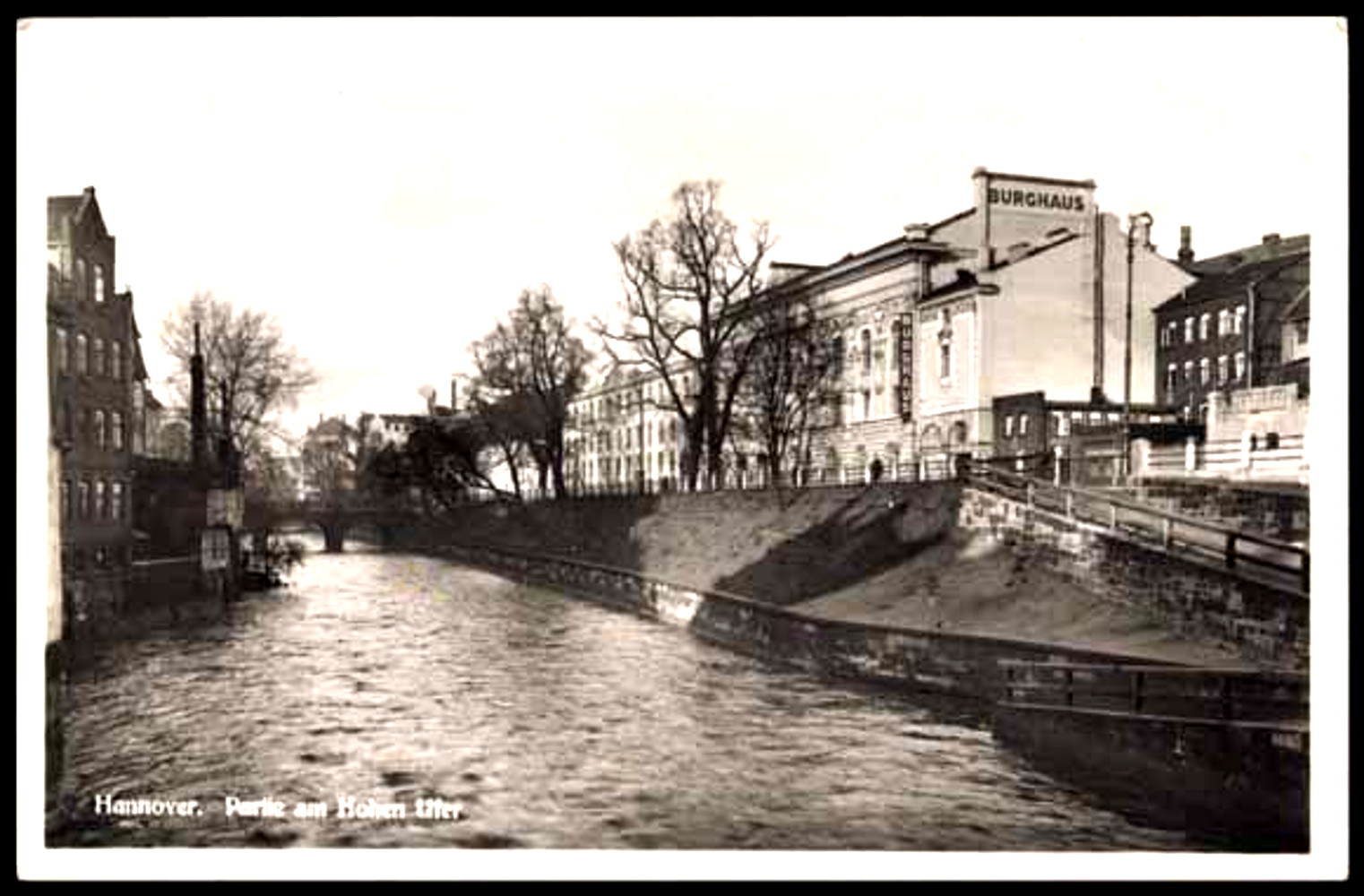 Fotopostkarte: Das „Burghaus“, später „Rusthaus“, des Verein für Fortbildung mit seiner Saalseite am Hohen Ufer, ohne Jahr (vor 1933). Privatbesitz