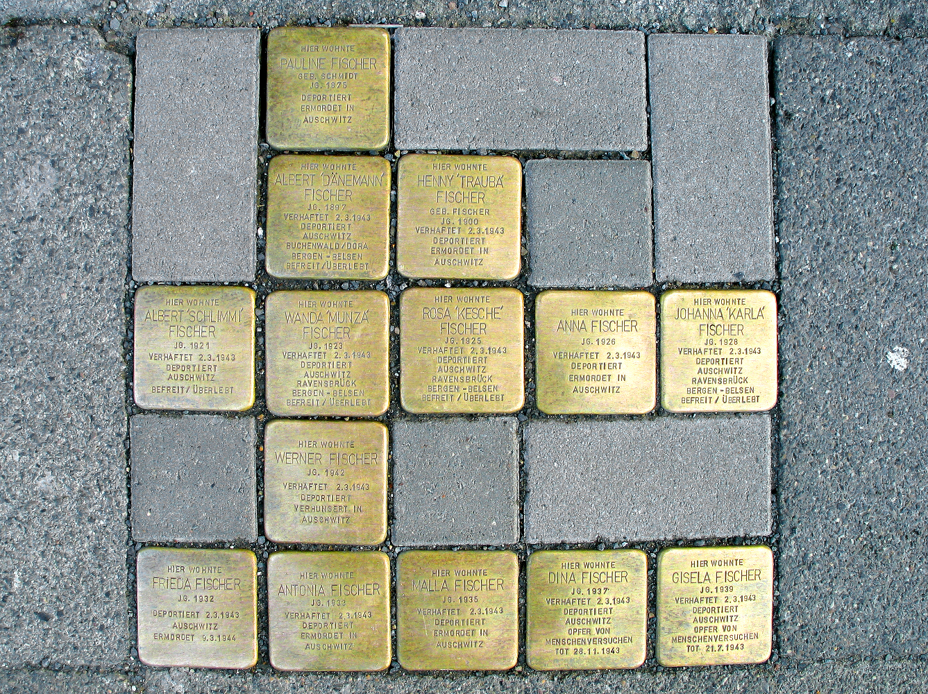 Hannover: Im Dezember 2012 verlegte Stolpersteine für die verfolgte Sinti-Familie Fischer, Röselerstraße 5-7. Städtische Erinnerungskultur Hannover