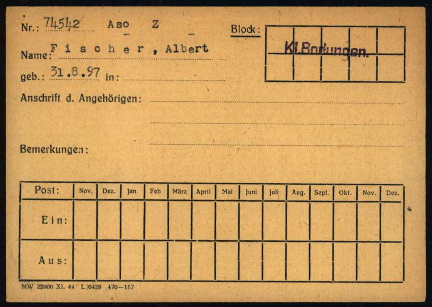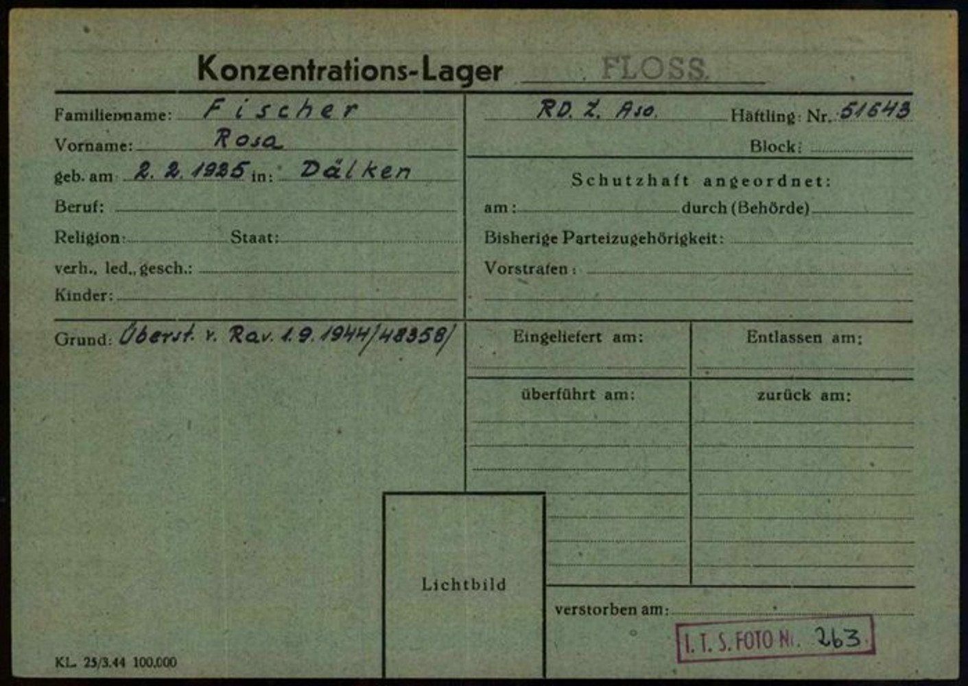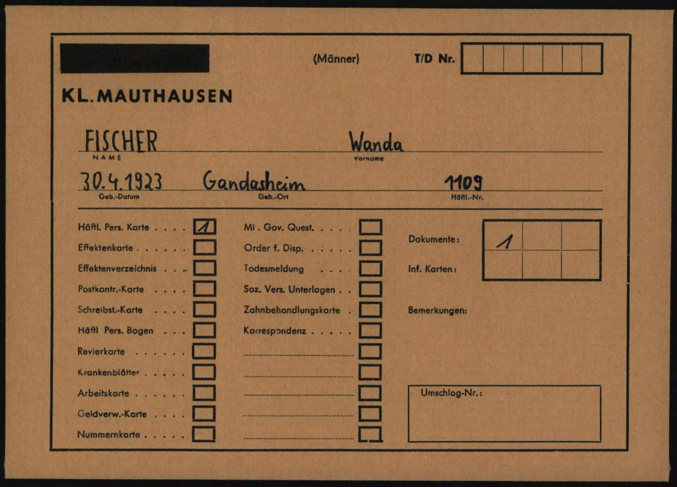 Registrierungskarte von Wanda Pranden, geb. Fischer im Konzentrationslager Mauthausen, Österreich. Quelle: Umschlag für Individualunterlagen Wanda Fischer, Individuelle Häftlings Unterlagen – KL Mauthausen, Frauen, 1.1.26.4 / 1877482 / ITS Digital Archive, Arolsen Archives