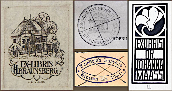 Traces of former owners: bookplate H.[?] Braunsberg; stamp Johannis-Loge zum Neuen Tempel Braunschweig; stamp Friedrich Bartens (Eimsen); bookplate Dr. Johanna Maass. Photo archive Hanover City Library